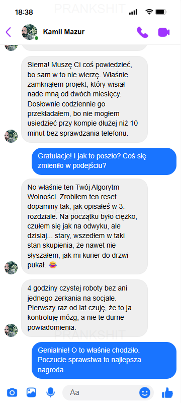 Przechodzę przez każdy możliwy scenariusz: gdy nie możesz rano wstać bez sięgnięcia po telefon, gdy prokrastynacja niszczy Twoje wyniki, gdy czujesz wieczne zmęczenie mimo braku ciężkiej pracy. Dostajesz jasny plan, który pozwoli Ci odciąć „tanią dopaminę” i zacząć dowozić rezultaty bez ciągłej walki z samym sobą.
