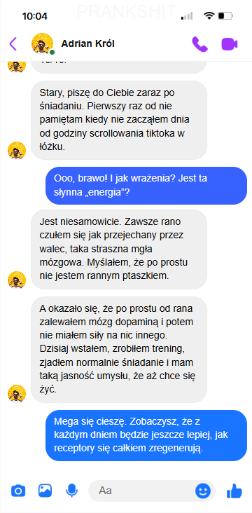 ✅ Koniec z mgłą mózgową – Twój umysł stanie się ostry, a myślenie klarowne już od pierwszych dni. ✅ Odzyskane skupienie – Nauczysz się wchodzić w stan głębokiej pracy bez rozpraszania się co 5 minut telefonem. ✅ Naturalna motywacja – Przestaniesz polegać na energetykach i kawie; Twoje paliwo do działania wróci do normy dzięki resetowi dopaminy. ✅ Pełna kontrola nad dniem – To Ty będziesz decydować, co robisz, zamiast być niewolnikiem algorytmów social mediów. ✅ Spokój i pewność siebie – Kiedy dowożesz swoje zadania, Twoje poczucie własnej wartości rośnie automatycznie.
